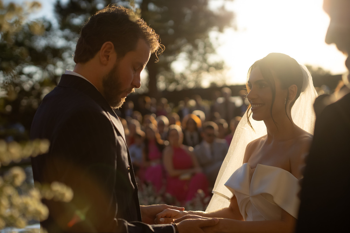 Esse pôr do sol dourado deu um toque sublime à cerimônia ao ar livre, eternizando os votos e os olhares em uma atmosfera que parecia um sonho.